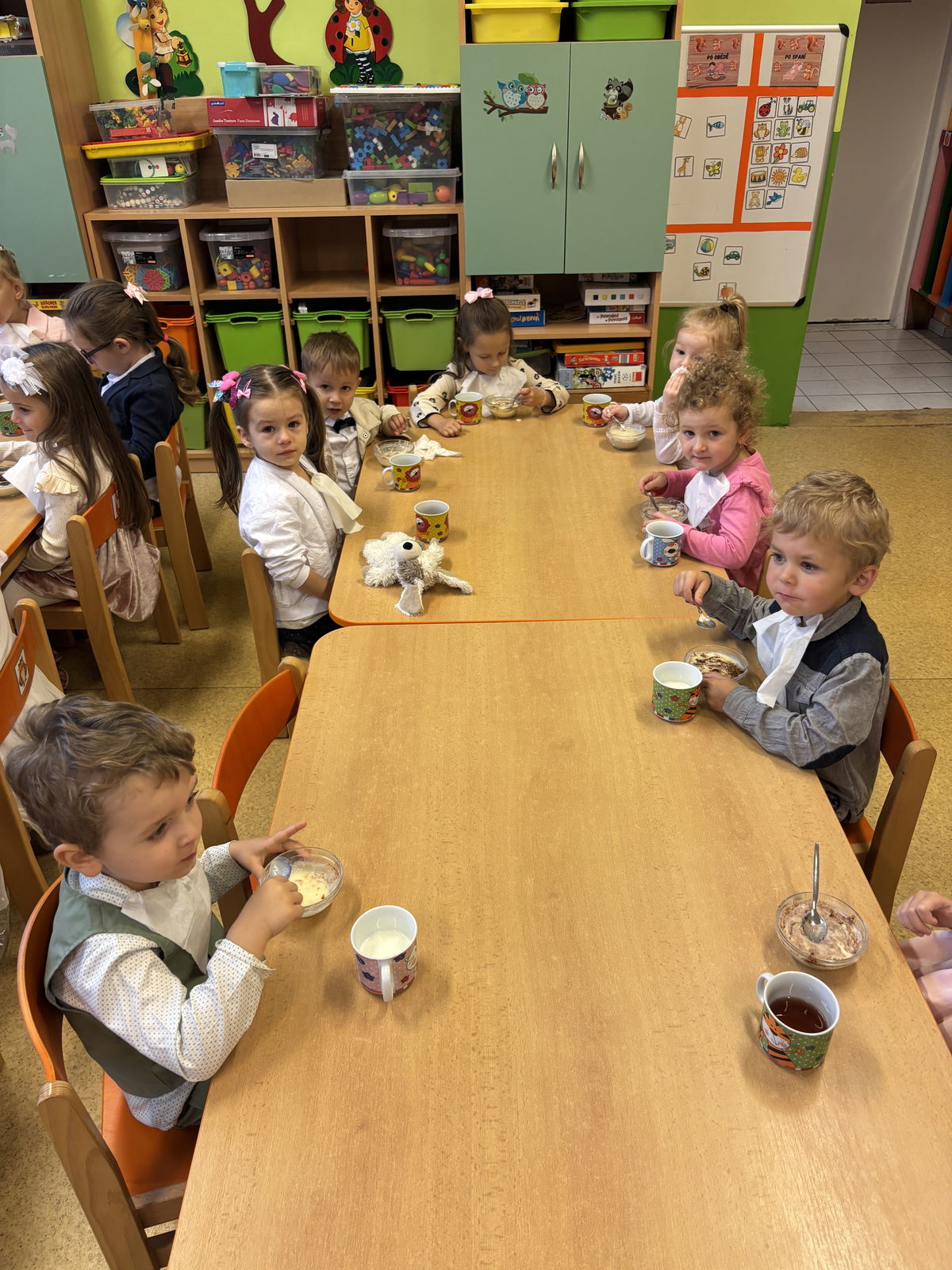 Celý den se nesl ve slavnostní atmosféře. Děti přišly v krásných šatech, košilích, motýlcích a vestičkách. Nechyběly ani klobouky, kabelky a další doplňky. Společně jsme si vyzkoušeli správné stolování a povídali o tom, jaké to je být gentlemanem nebo dámou - co znamená slušné chování, pozdrav, poděkování a pomoc druhým.