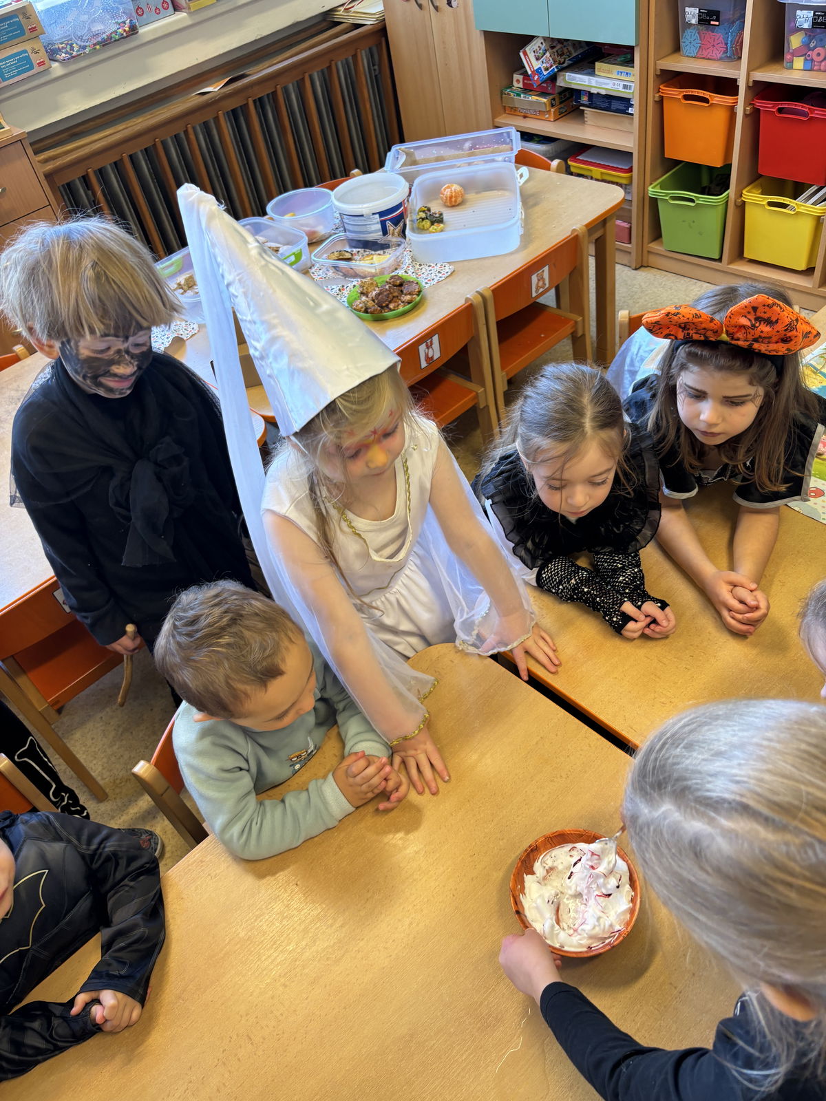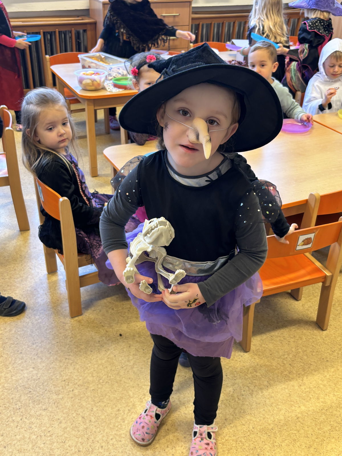 Během dne jsme si užili spousty zábavy a strašidelného tvoření - vařili jsme kouzelné lektvary, děti kouzlily se štětcem a záhadným nápojem, nechybělo ani strašidelné občerstvení. Ve třídě vládla tajemná, ale veselá atmosféra, plná smíchu a kouzel.