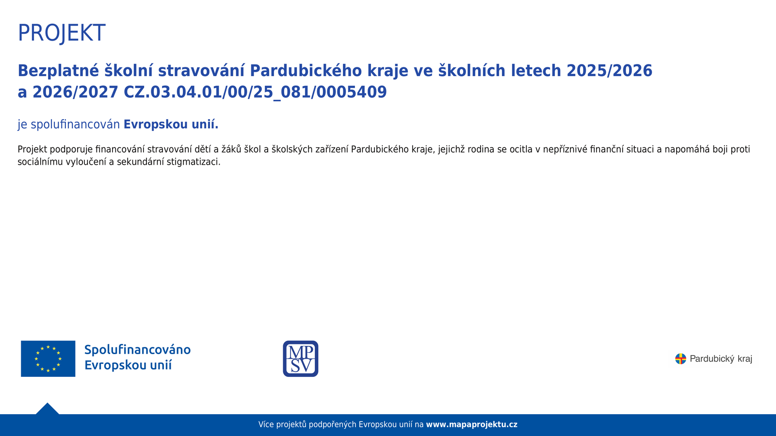 Tento projekt je realizován v rámci výzvy č. 03_25_081 Potravinová pomoc dětem v sociální nouzi (2) v Operačním programu Zaměstnanost plus vyhlašovaný MPSV. Bezplatné školní stravování se zaměřuje na zajištění dostupnosti školního stravování pro děti a žáky ve věku 2–26 let v Pardubickém kraji, kteří pocházejí ze sociálně a ekonomicky znevýhodněných rodin.
