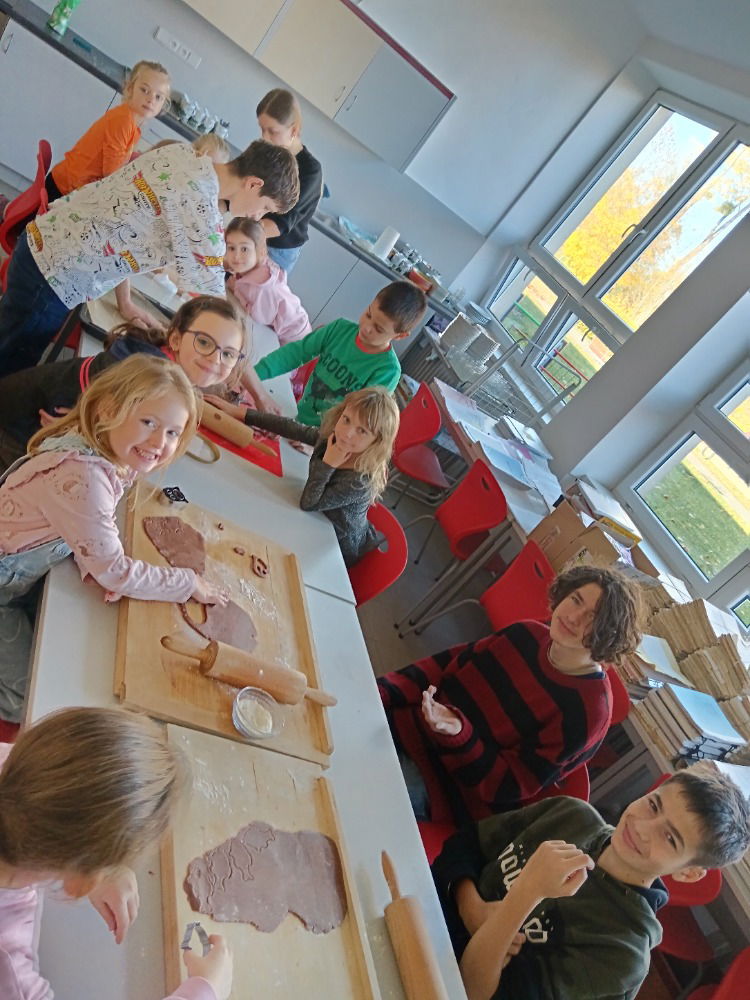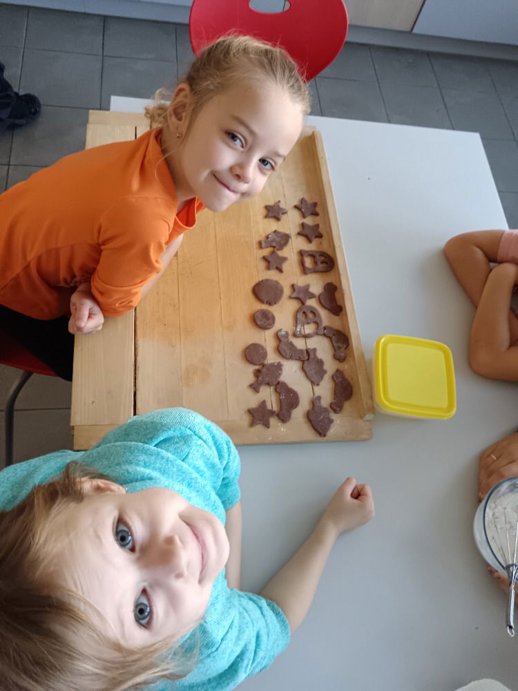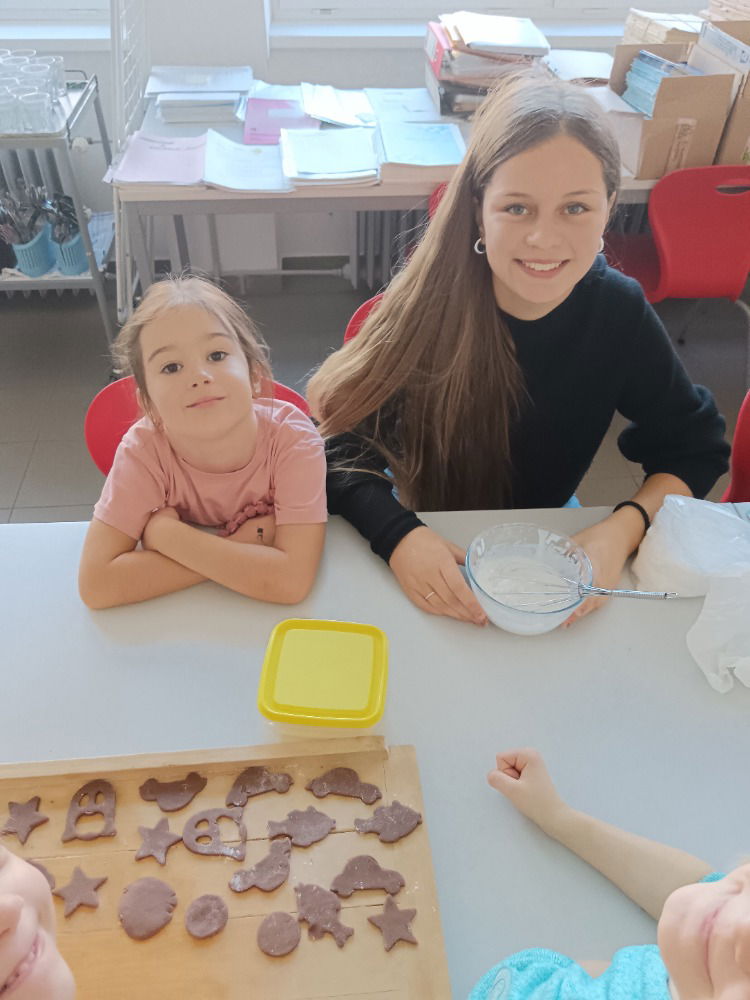 Deváťáci se o prvňáčky s velkou péčí starali – pomáhali jim s válením těsta, vykrajováním strašidelných tvarů i s zdobením hotových perníčků. Společné tvoření provázela dobrá nálada, smích a vůně čerstvě upečeného cukroví.