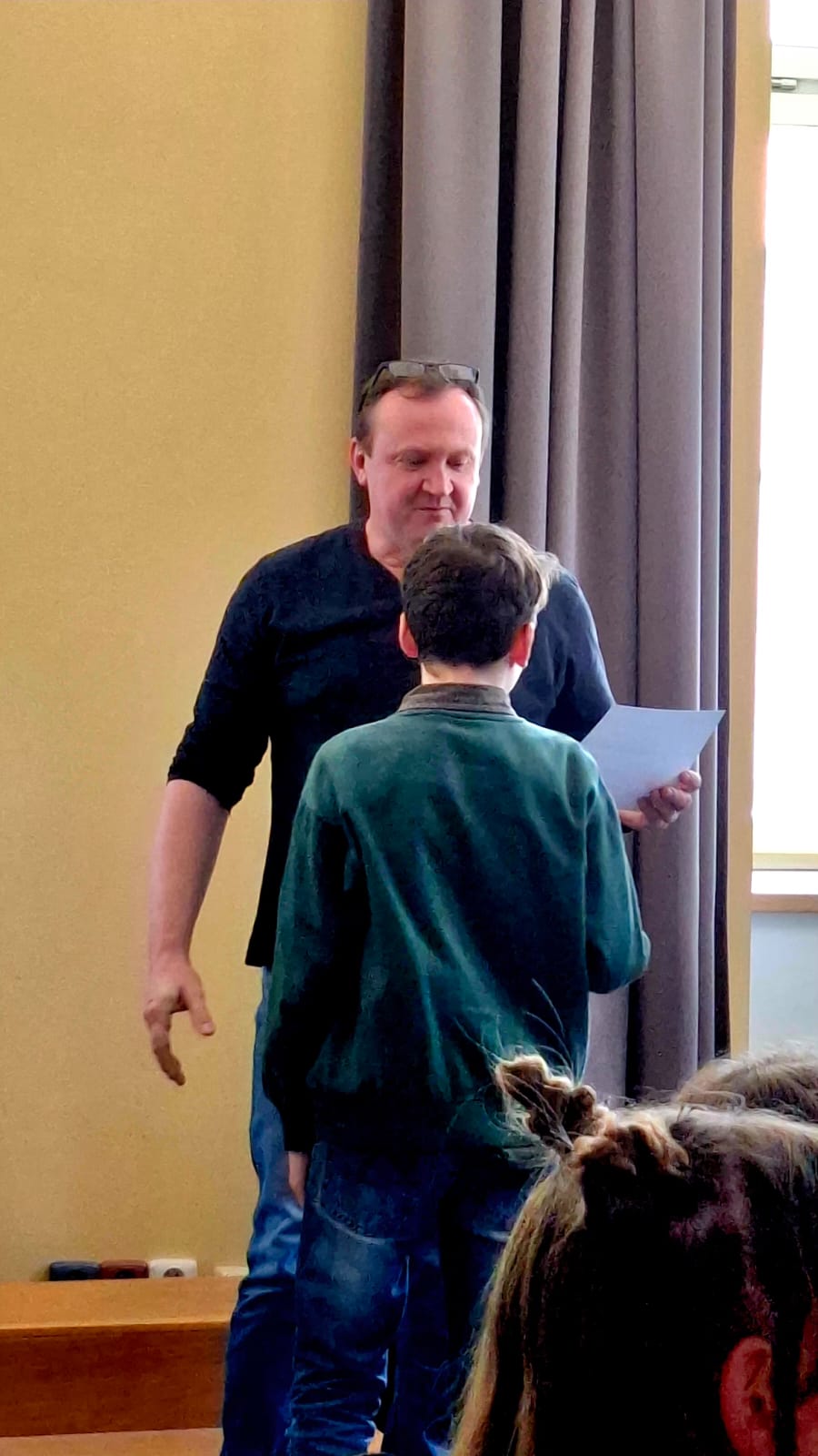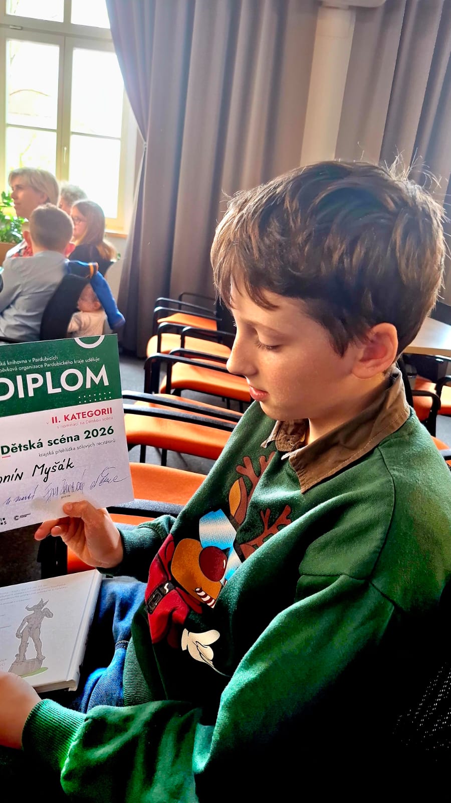 S radostí oznamujeme, že náš žák Antonín Myšák dosáhl mimořádného úspěchu v krajském kole recitační soutěže Dětská scéna 2026, které se konalo 21. dubna 2026 v Pardubicích. V silné konkurenci recitátorů z celého Pardubického kraje svým výkonem zaujal porotu natolik, že si odnesl 1. místo a zároveň postup do celostátního kola.